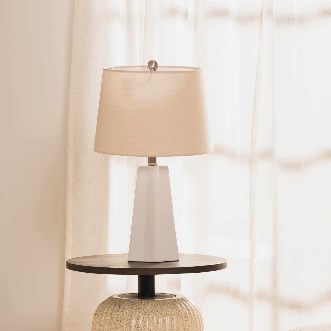 Material: Body: Ceramic,Shade (Outside): Linen,Shade (Inside): Polyester,Finial: Iron |
